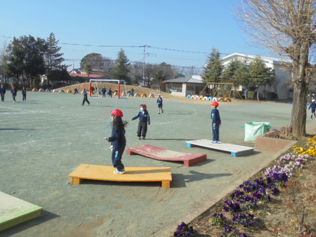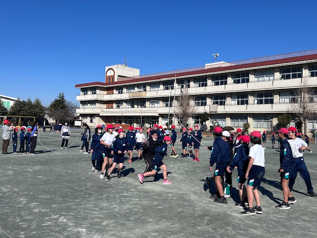 寒い日が続いていますが、子供たちは、さわやか運動や体育の授業、休み時間などで、なわとび練習を頑張っています。校庭に設置したジャンプ台は、常に子供たちの練習場です。さわやか運動では、時間跳びの他に、クラス毎に1分間8の字跳びに取り組み、記録を競い合っています。